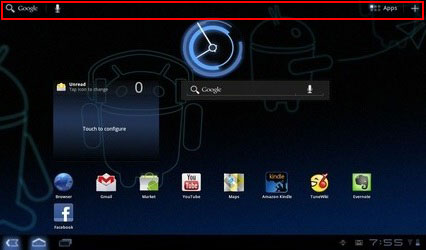 หน้าจอหลักประกอบไปด้วยส่วนที่สำสียง และสวิตช์เลื่อนเพื่อล็อคการหมุนจอ เพื่อใช้งานในแนวตั้ง หรือแนวนอนอย่างเดียว